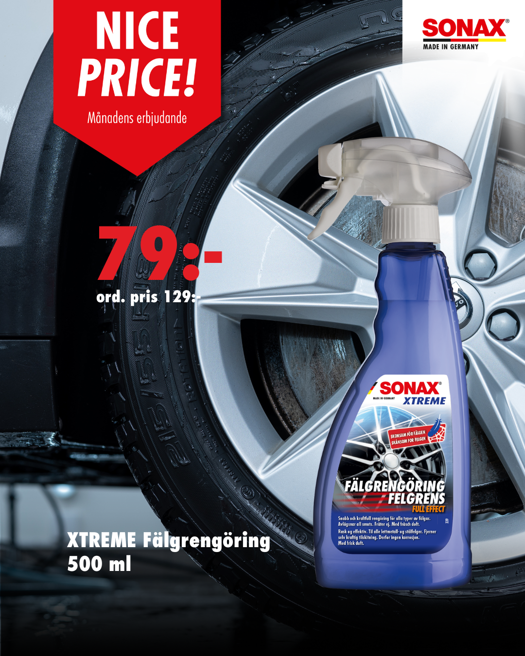 SONAX däck- och fälgprodukter är särskilt framtagna för att effektivt och skonsamt rengöriaav både däck och fälgar. Produkterna är populära bland både bilentusiaster och professionella bilvårdsspecialister för sin höga prestanda och användarvänlighet. SONAX olika fälgrengöringar är kraftfulla produkter som effektivt löser upp och avlägsnar envis smuts som bromsdamm, oljeavlagringar, tjära, vägsmuts och andra föroreningar som samlas på fälgarna över tid. Produkterna är utformade för att vara säkra att använda på alla typer av fälgar, inklusive aluminium-, stålfälgar, lackade, polerade, kromade och anodiserade fälgar. Löser snabbt upp inbränt bromsdamm och andra föroreningar utan att kräva hårt skrubbande. Produkterna är pH-neutrala och skonsamma mot alla typer av fälgar, vilket minimerar risken för skador eller missfärgningar. Många av SONAX fälgrengöringsprodukter är även färgindikerande vilket innebär att de ändrar färg när produkten reagerar med smutsen, vilket gör det lätt att se när det är dags att skölja av. Fälgrengöringarna är dessutom enkla att använda; spraya bara på, låt verka och skölj av med vatten, helst med högtryckstvätt för bästa resultat.