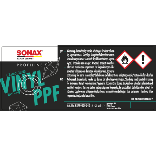 SONAX PROFILINE Ceramic Coating CC Vinyl+PPF är det ultimata valet för bilägare och professionella som vill ge vinyl och skyddsfilmer ett överlägset skydd och långvarig glans. Denna produkt säkerställer att din bil ser ny och välvårdad ut under lång tid, samtidigt som den ger ett pålitligt skydd mot yttre påfrestningar.