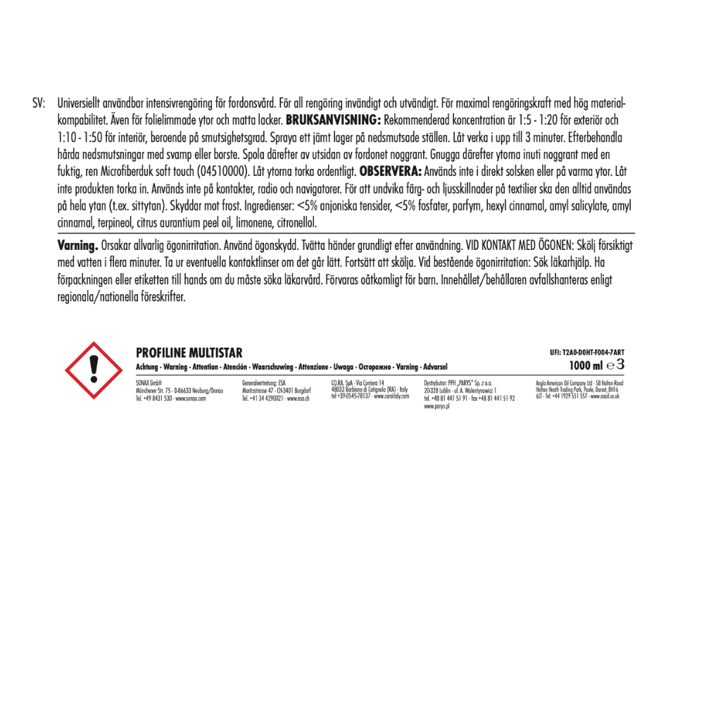 SONAX PROFILINE Multistar är den perfekta bilvårdsprodukten för professionella användare och entusiaster som söker en effektiv, högkvalitativ allrengöring (APC) som klarar alla utmaningar, både invändigt och utvändigt. Ett måste för semi-proffsen att ha hemma i sina garage.