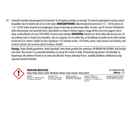 PROFILINE Multistar är en mångsidig och kraftfull allrengöringsprodukt (APC) som är perfekt för både interiör och exteriör bilvård. Med sin avancerade formula rengör den effektivt alla ytor, från textilier och plast till lack och motorutrymmen, och tar enkelt bort smuts, fett och andra föroreningar. Multistar är utvecklad för professionella användare och levererar ett imponerande resultat med minimal ansträngning.
